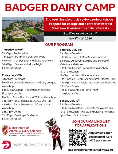 For more details: Badger Dairy Camp – Animal & Dairy Sciences